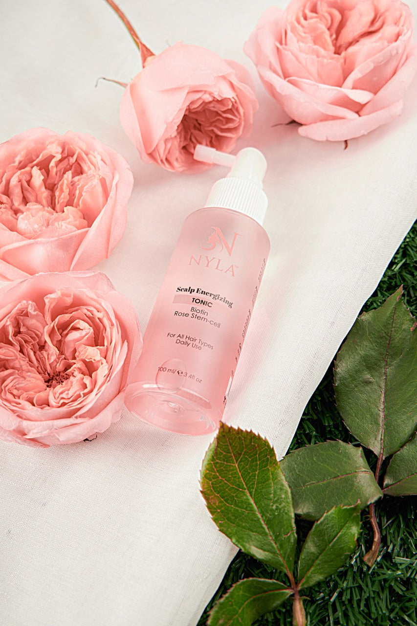 beautiful, voluminous locks. Say goodbye to bad hair days and hello to the beauty and resilience of our BIOTIN and Rose Stem Cell hair tonic.